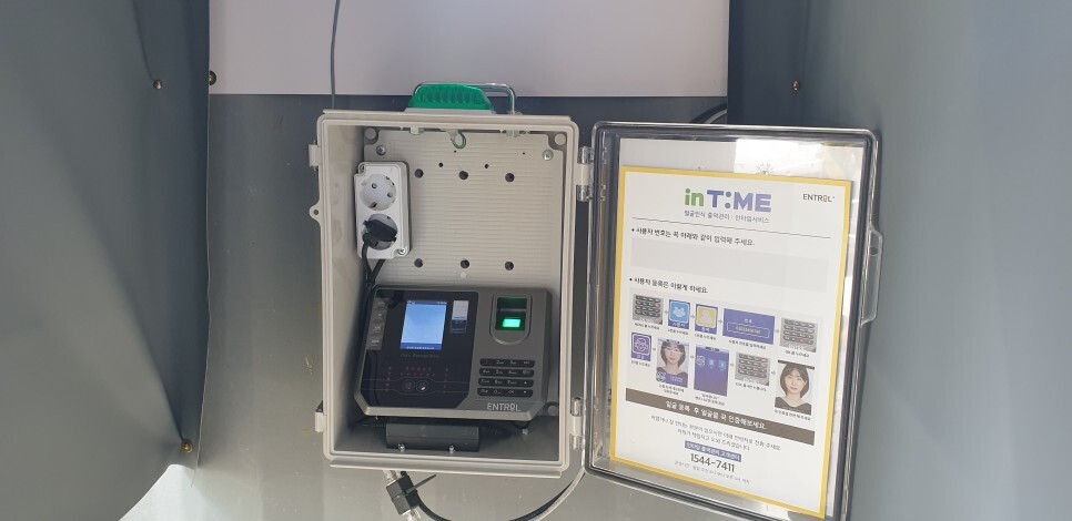 안녕하세요.... 직원 출퇴근 확인용으로 출역관리센터 인타임 라벨 5 / 7 가 설치되었습니다. 전원과 네트...