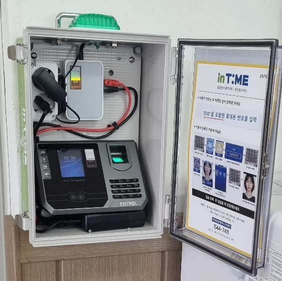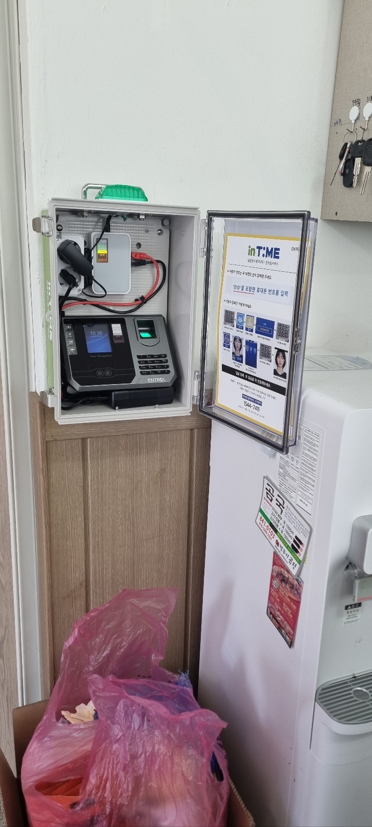 안녕하세요.... 직원 출퇴근 확인용으로 출역관리센터 인타임 라벨 5 / 7 가 설치되었습니다. 전원과 네트...