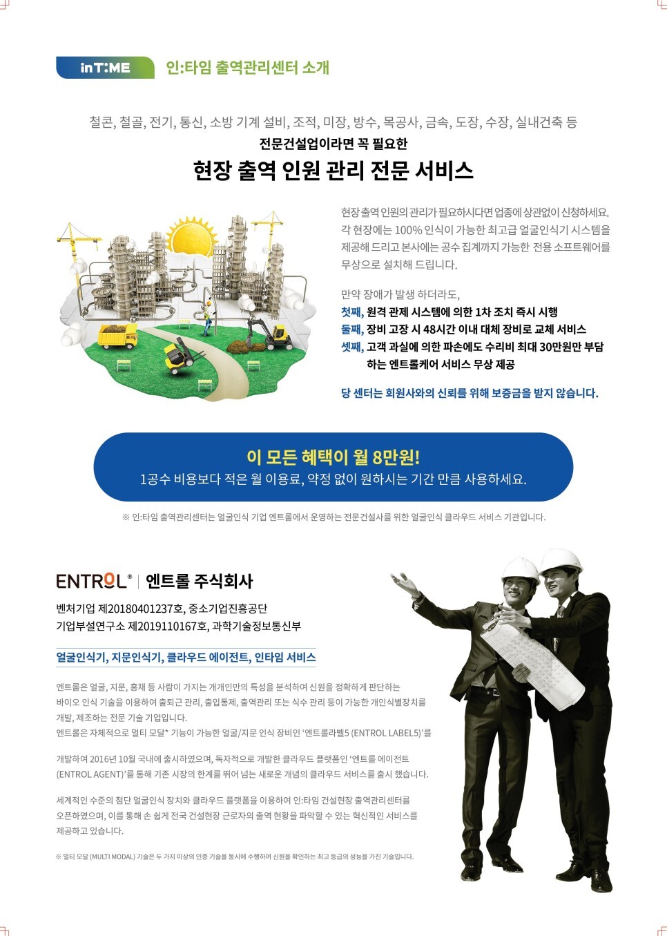인타임 서비스 | 건설현장 얼굴인식 출역관리센터 인타임입니다. 부담없는 비용으로 전국 현장 출역관리를 맡기세요. 최고급 얼굴인식 장비를 제공하고 유지 보수와 관리까지. 귀사의 친절한