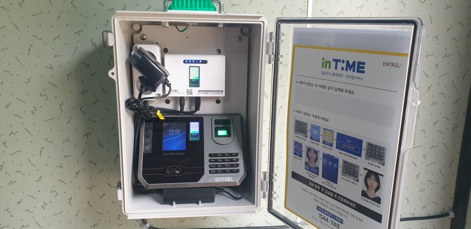 안녕하세요.... 직원 출퇴근 확인용으로 출역관리센터 인타임 라벨 5 / 7 가 설치되었습니다. 전원과 네트...