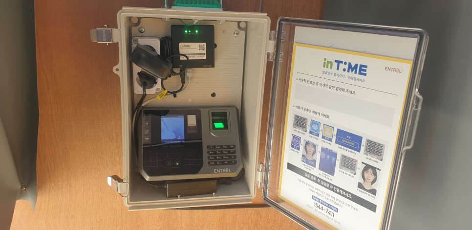 안녕하세요.... 직원 출퇴근 확인용으로 출역관리센터 인타임 라벨 5 / 7 가 설치되었습니다. 전원과 네트...
