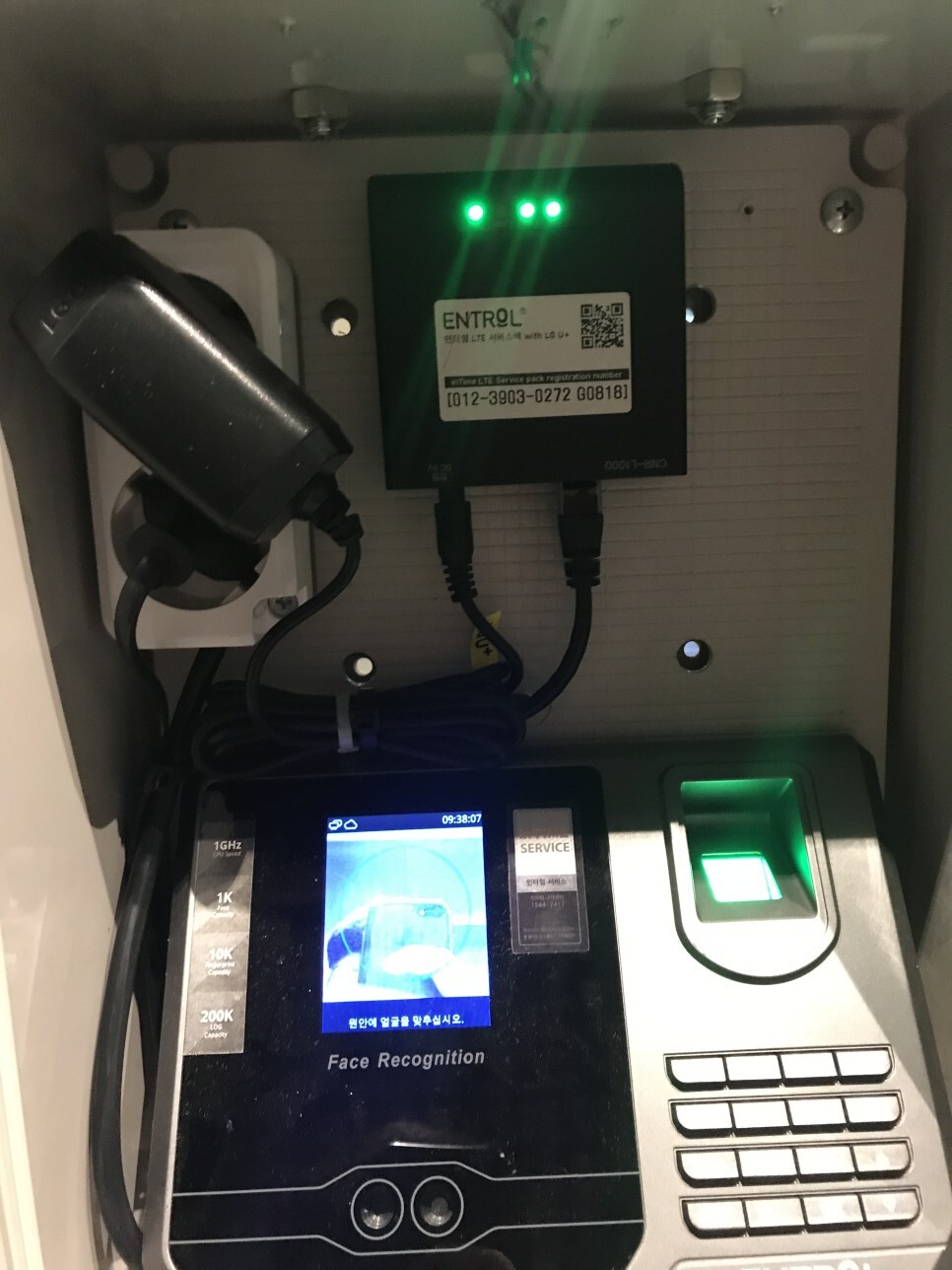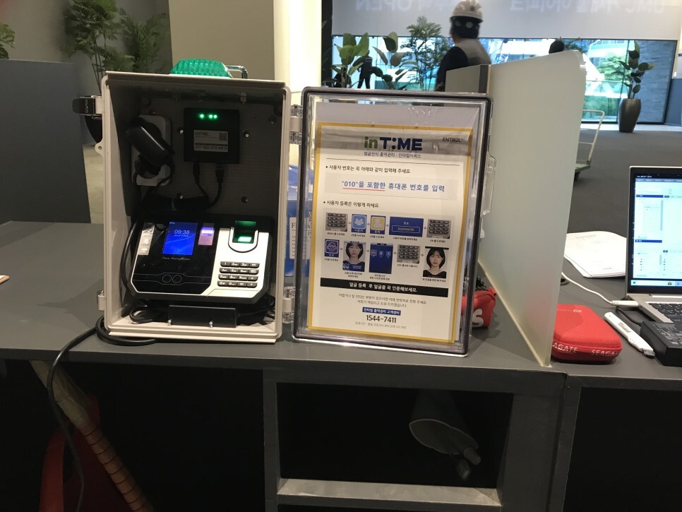 안녕하세요.... 직원 출퇴근 확인용으로 출역관리센터 인타임 라벨 5 / 7 가 설치되었습니다. 전원과 네트...